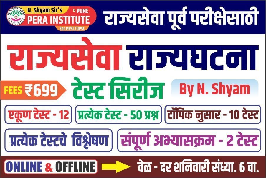 MPSC राज्यसेवा राज्यघटना पूर्व परीक्षा TEST SERIES ⚡️राज्यसेवा राज्यघटना पूर्व परीक्षा टेस्ट सिरीज 🛑OFFLINE/ONLINE दोन्ही स्वरुपात 🛑एकूण टेस्ट- 12 🛑प्रत्येक टेस्ट- 50 प्रश्न ( गुण - 50 ) 🛑टॉपिक नुसार टेस्ट- 10 🛑संपूर्ण अभ्यासक्रम वर - 2 टेस्ट 🛑टेस्टचा दिवस - दर शनिवारी संध्या. 6 PM 🛑टेस्ट विश्लेषण - टेस्ट नंतर रेकॉर्डेड स्वरुपात 1 तासांचे विश्लेषण App link--- https://qtref.on-app.in/app/home?orgCode=qtref&referrer=utm_source=copy-link&utm_medium=tutor-app-referral Free lec. साठी YouTube - PERA INSTITUTE https://youtube.com/@perainstitute?si=eVCdFqBmUtDQR0eI Teligram- @PERAINSTITUTE Whatsapp- https://wa.me/+919004611932 पत्ता- ओझस कॉम्प्लेक्स,एसपी बिर्याणी जवळ,एस.पी.कॉलेज समोर,सदाशिवपेठ,पुणे LOCATION- https://maps.app.goo.gl/HXnexm8q2hv8oWnp8 Ph-9004611932 / 9209230915